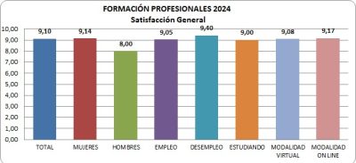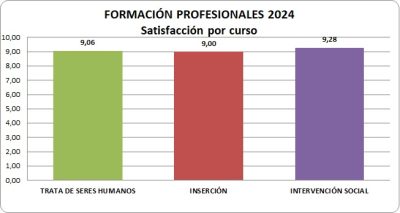En la valoración de la formación por parte del alumnado, destacamos que la media de satisfacción es de 9,10 sobre 10. Por Cursos, en el Curso de Trata, la media de satisfacción es de 9,06 sobre 10. En el Curso de Inserción, la media de satisfacción es de 9 sobre 10. En el Curso de Intervención Social, la media de satisfacción es de 9,28 sobre 10. Según datos desagregados por sexo, las mujeres muestran una media de satisfacción de 9,14 sobre 10 y los hombres de 8 sobre 10. Por Situación Laboral, quienes tienen empleo muestran una media de satisfacción de 9,05 sobre 10, en situación de desempleo de 9,40 sobre 10 y estudiando 9 sobre 10. Por Modalidad de formación, VIRTUAL muestran una media de satisfacción de 9,08 sobre 10 y ON LINE de 9,17 sobre 10.