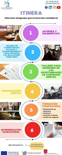 En Asociación AD Los Molinos ofrecemos un servicio de apoyo y acompañamiento al empleo, mediante itinerarios personalizados e integrados de inserción social, laboral e intermediación con empresas, así como trabajo coordinado y en red con recursos del entorno, desde principios de igualdad de oportunidades, diversidad cultural y responsabilidad social.