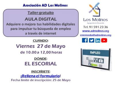 - Requisitos: Teléfono/ordenador con conexión a internet. Conocimientos de español nivel medio. Estar inscrita/o en el Servicio de Empleo de Asociación AD Los Molinos.