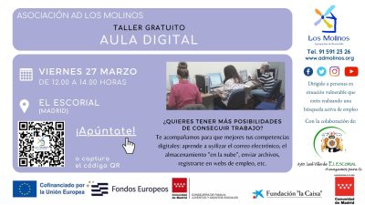 - Requisitos: Conocimientos de español nivel medio. Estar inscrita/o en el Servicio de Empleo de Asociación AD Los Molinos.
