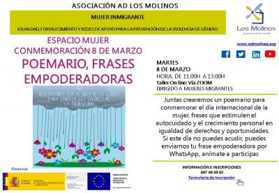 - Contenido: Entre todas las participantes, se creará un poemario de frases estimuladoras, que levanten el ánimo y fortalezcan el crecimiento personal en igualdad y derechos.