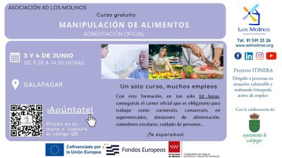 - Requisitos: Conocimientos de español nivel medio. Estar inscrita/o en el Servicio de Empleo de Asociación AD Los Molinos.