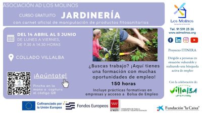 - Requisitos: Conocimientos de español nivel medio. Estar inscrita/o en el Servicio de Empleo de Asociación AD Los Molinos.