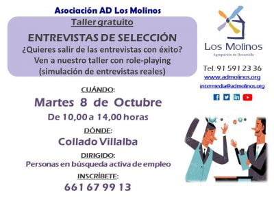 - Requisitos: Conocimientos de castellano nivel medio. Estar dado/a de alta en el Servicio de Empleo de Asociación AD Los Molinos.