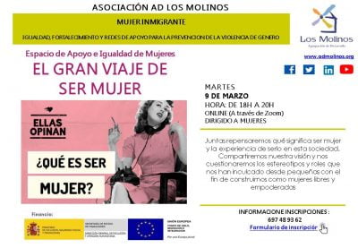 - Contenido: Juntas repensaremos qué significa ser mujer y sobre la experiencia de serlo en esta sociedad. Compartiremos nuestra visión y nos cuestionaremos los estereotipos y roles que nos han inculcado desde pequeñas para construirnos como mujeres libres y empoderadas.