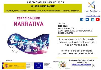 - Contenido: Taller de narrativa, en aque nos lanzaremos a narrar historias de mujeres combinando realidad y ficción y perderemos el temor a expresarse. Enriqueceremos nuestra realidad por medio de esta actividad empoderadora.