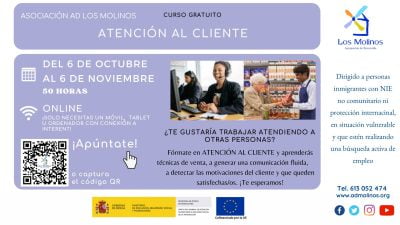 - Requisitos: Teléfono/ordenador con conexión a internet. Conocimientos de español nivel medio. Estar dado/a de alta en el Servicio de Empleo de Asociación AD Los Molinos.