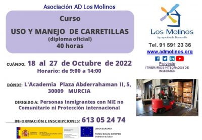 - Requisitos: Conocimientos de español nivel medio. Estar dado/a de alta en el Servicio de Empleo de Asociación AD Los Molinos.