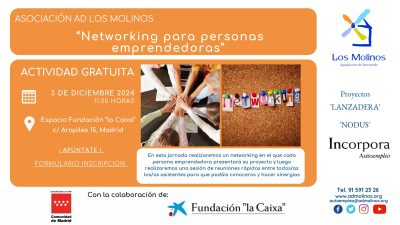 - Contenido: En esta jornada realizaremos un networking en el que cada persona emprendedora presentará su proyecto y luego realizaremos una sesión de reuniones rápidas entre todos/as los/as asistentes para que podáis conoceros y hacer sinergias.