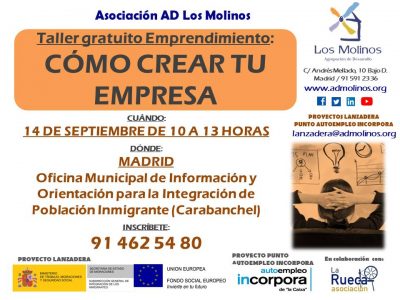 - Inscripción: 91 462 54 80 / 91 59123 36 / lanzadera@admolinos.org