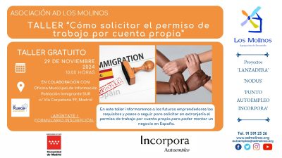 - Contenido: En este taller informaremos a los futuros emprendedores los requisitos y pasos a seguir para solicitar en extranjería el permiso de trabajo por cuenta propia para poder montar un negocio en España.