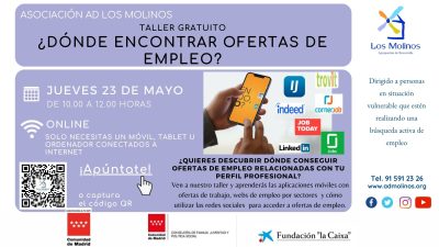- Requisitos: Teléfono/ordenador con conexión a internet. Conocimientos de español nivel medio. Estar inscrita/o en el Servicio de Empleo de Asociación AD Los Molinos.