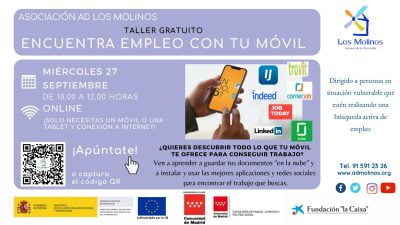 - Requisitos: Teléfono/ordenador con conexión a internet. Conocimientos de español nivel medio. Estar inscrita/o en el Servicio de Empleo de Asociación AD Los Molinos.