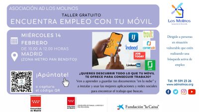 - Requisitos: Teléfono/ordenador con conexión a internet. Conocimientos de español nivel medio. Estar inscrita/o en el Servicio de Empleo de Asociación AD Los Molinos.