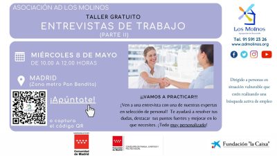 - Requisitos: Teléfono/ordenador con conexión a internet. Conocimientos de español nivel medio. Estar inscrita/o en el Servicio de Empleo de Asociación AD Los Molinos.