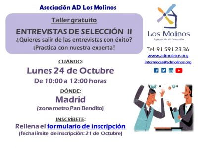 - Contenido: Role playing de entrevistas de selección: ¡practica con una de nuestras expertas en el tema como si fuera una entrevista de trabajo real! Te ayudará a reforzar lo que ya haces bien y a superar aquellos aspectos que tengas que mejorar.