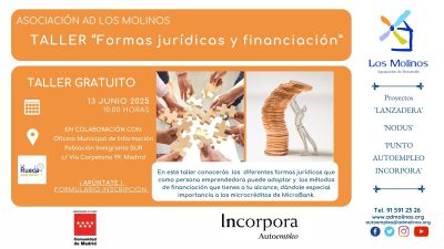- Contenido: En este taller conocerás los diferentes formas jurídicas que como persona emprendedora puede adoptar y los métodos de financiación que tienes a tu alcance, dándole especial importancia a los microcréditos de MicroBank.