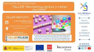 - Contenido: En este taller informaremos a nuestros emprendedores/as sobre las diferentes herramientas para dar a conocer y promocionar un producto o servicio y las estrategias para alcanzarlo y posicionarlo en las diferentes redes sociales.