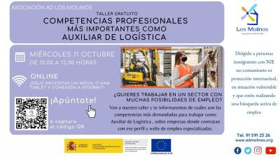 - Requisitos: Teléfono/ordenador con conexión a internet. Conocimientos de español nivel medio. Estar inscrita/o en el Servicio de Empleo de Asociación AD Los Molinos.