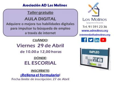 - Requisitos: Teléfono/ordenador con conexión a internet. Conocimientos de español nivel medio. Estar inscrita/o en el Servicio de Empleo de Asociación AD Los Molinos.
