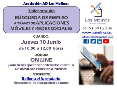 - Requisitos: Teléfono/ordenador con conexión a internet. Conocimientos de castellano nivel medio. Estar dado/a de alta en el Servicio de Empleo de Asociación AD Los Molinos.