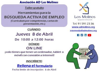 - Requisitos: Teléfono/ordenador con conexión a internet. Conocimientos de castellano nivel medio. Estar dado/a de alta en el Servicio de Empleo de Asociación AD Los Molinos.