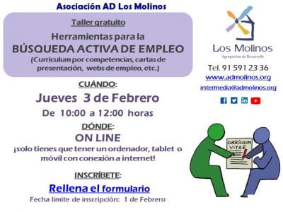 - Requisitos: Teléfono/ordenador con conexión a internet. Conocimientos de español nivel medio. Estar inscrita/o en el Servicio de Empleo de Asociación AD Los Molinos.