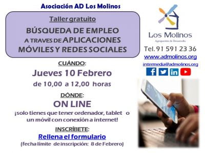 - Requisitos: Teléfono/ordenador con conexión a internet. Conocimientos de español nivel medio. Estar inscrita/o en el Servicio de Empleo de Asociación AD Los Molinos.