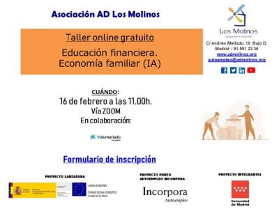 - Contenido: Taller para conocer conceptos financieros básicos y disponer de herramientas para mejorar nuestra economía personal y así afrontar la toma de dediciones financieras con mayor seguridad. Taller impartido por los Voluntariado CaixaBank
