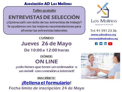 - Requisitos: Teléfono/ordenador con conexión a internet. Conocimientos de español nivel medio. Estar inscrita/o en el Servicio de Empleo de Asociación AD Los Molinos.