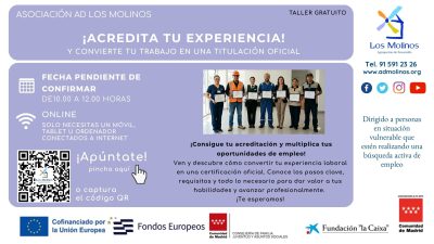 - Contenido: Taller sobre el proceso de acreditación de la experiencia laboral y cómo puedes transformar tus conocimientos y habilidades, adquiridos a través del trabajo, en una certificación oficial. Se explicarán los requisitos, fases del procedimiento, documentación necesaria, etc. para informarte sobre todo el proceso.