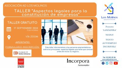 - Contenido: Este taller informaremos a las personas emprendedoras sobre los principales aspectos legales que tiene que conocer antes de iniciar su negocio.
