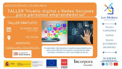 - Contenido: En este taller informaremos a nuestros emprendedores/as sobre como difundir su proyecto a través de las redes sociales y comenzar a crear una imagen de marca.