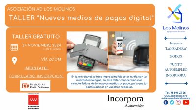 - Contenido: En la era digital se hace imprescindible estar al día con las nuevas tecnologías, en este taller conoceremos las características de los nuevos medios de pago, para que los podáis aplicar en vuestros negocios.