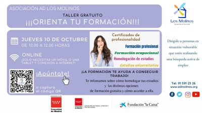 - Requisitos: Teléfono/ordenador con conexión a internet. Conocimientos de español nivel medio. Estar inscrita/o en el Servicio de Empleo de Asociación AD Los Molinos.