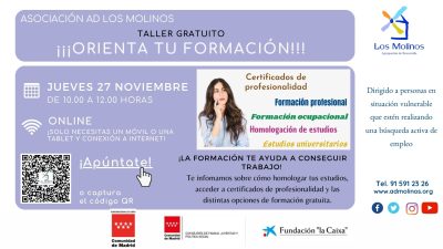- Requisitos: Conocimientos de español nivel medio. Disponer de smartphone, tablet u ordenador con conexión a internet. Estar inscrita/o en el Servicio de Empleo de Asociación AD Los Molinos.
