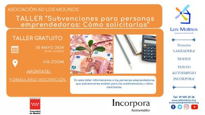 - Contenido: En este taller informaremos a las personas emprendedoras que subvenciones existen para los autónomos/as y cómo solicitarlas.
