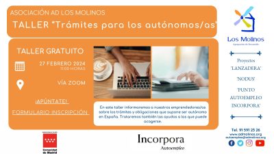 - Contenido: En este taller informaremos a nuestros emprendedores/as sobre los trámites y obligaciones que supone ser autónomo en España. Trataremos también las ayudas a las que puede acogerse.