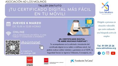 - Contenido: Acompañamiento en la solicitud, instalación en el teléfono móvil e indicaciones sobre los múltiples usos del Certificado Digital: acceder a la vida laboral, tramitar becas y ayudas económicas, consultar expedientes en Extranjería, Agencia Tributaria, etc.
