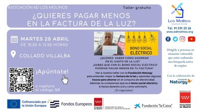- Contenido: Taller impartido por la Fundación Naturgy para entender mejor la factura de la luz y aprender algunos trucos para ahorrar en el consumo de electricidad. Además, te contaremos qué es el bono social eléctrico, si tienes derecho a él y cómo solicitarlo.