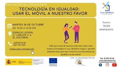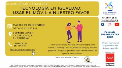 - Contenido: Taller que tratará de hacernos reflexionar sobre cómo usamos la tecnología en casa, identificar riesgos y aprender pequeños trucos para que el móvil sea una herramienta de igualdad y no de control.
